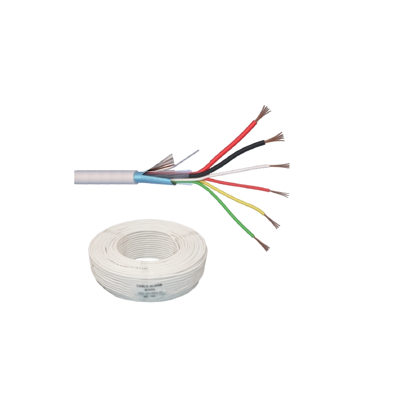 Cablu de alarma 6 fire, alimentare 2x0.75, ecranat, Cupru 100% 6 fire x 0.22 , 2 fire x 0.75, Cu 100%, diametru exterior 5.8 mm, ecranaj. Include fir de sectionare camasa PVC. Rezistent la flacara - CEI20-22 III, IEC60331-3 Ambalare la tambur de 100 metri. (RoHS)