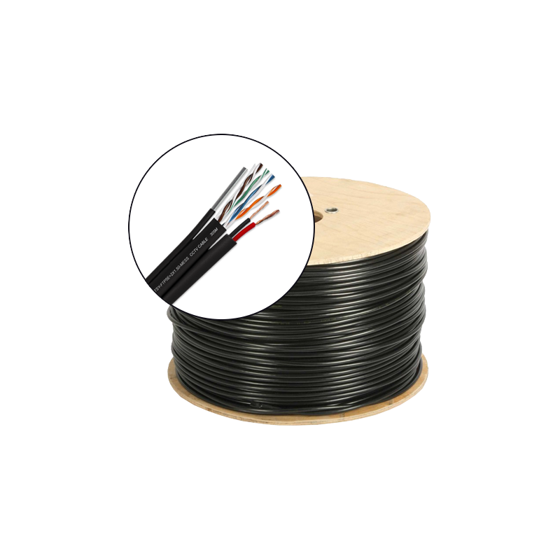 Cablu FTP cat 5E CUPRU 100% cu alimentare 2x1.5, sarma gavanizata de sustinere, 4x2 fire torsadate din CUPRU MASIV 0.51mm, folie ecranaj, fir masa, tambur lemn de 305m.
