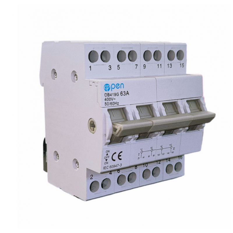 Echipat cu patru poli (4P), comutatorul poate gestiona un curent nominal de 63A și este compatibil cu rețele electrice trifazate de 400V. Funcționalitatea sa permite o utilizare simplă și intuitivă, permițând utilizatorilor să comute manual între sursele de energie principală și de rezervă.