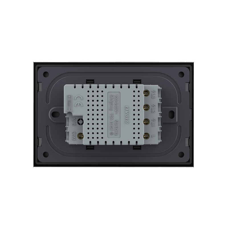 Intrerupator triplu cap scara / cap cruce cu touch Livolo cu rama din sticla, standard Italian, cu textura de crystal, indicator de lumina, rezistent la umiditate si la zgarieturi, rafinament la superlativ. Intrerupatoarele Livolo folosesc un senzor tactil cu 100 ms timp de raspuns, similar cu tehnologia folosita la smartphone-uri. Panoul din sticla al intrerupatorului, este din sticla securizata, rezistenta la foc. Ledul rosu/albastru indica statusul on/off al intrerupatorului.