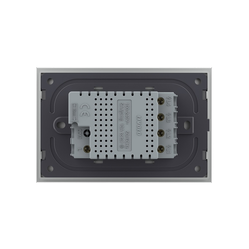 Intrerupatorul cvadruplu cu touch din sticla Livolo - standard Italian VL-C304, are un design contemporan si se potriveste cu interiorul oricarei case moderne sau clasice. Intrerupatoarele Livolo folosesc un senzor tactil cu 100ms timp de raspuns, similar cu tehnologia folosita la smartphone-uri. Panoul din sticla al intrerupatorului, este din sticla securizata, rezistenta la foc. Ledul rosu/albastru indica statusul on/off al intrerupatorului si poate fi cu usurinta identificat in intuneric. Intrerupatoarele standard italian sunt compatibile cu dozele modulare in 3 module cu distanta dintre suruburi de 85mm.
