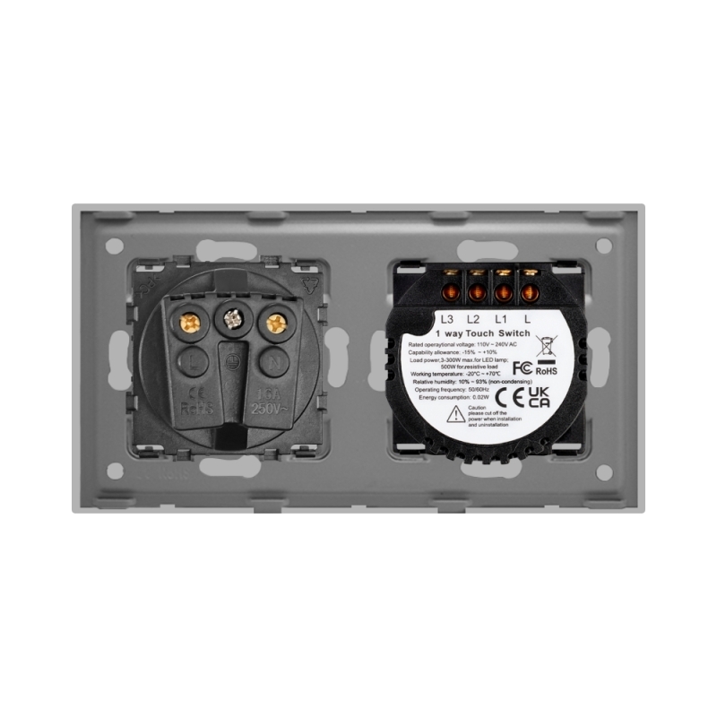 Intrerupator triplu + priza cu rama din sticla LUXION se diferentiaza prin design-ul compact, elegant si minimalist. Structura este durabila, iar produsele nu se decoloreaza in timp. Este un produs practic, fabricat din materiale de calitate si rezistente in timp, ce ofera utilitate si confort casei tale.