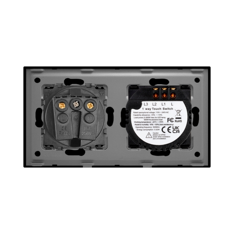 Intrerupator dublu + priza cu rama din sticla LUXION cu design compact, elegant si minimalist. Structura este durabila, iar produsele nu se decoloreaza in timp. Este un produs practic, fabricat din materiale de calitate si rezistente in timp, ce ofera utilitate si confort casei tale.