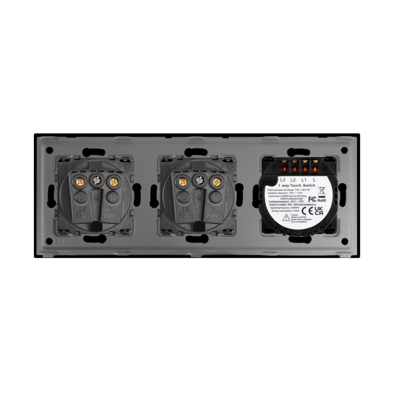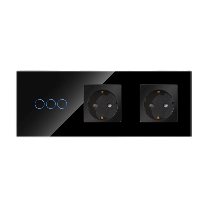 Intrerupator triplu + 2 prize cu rama din sticla LUXION cu design compact, elegant si minimalist. Structura este durabila, iar produsele nu se decoloreaza in timp. Este un produs practic, fabricat din materiale de calitate si rezistente in timp, ce ofera utilitate si confort casei tale.