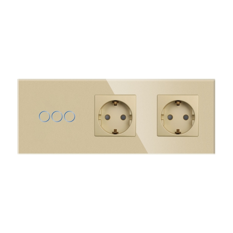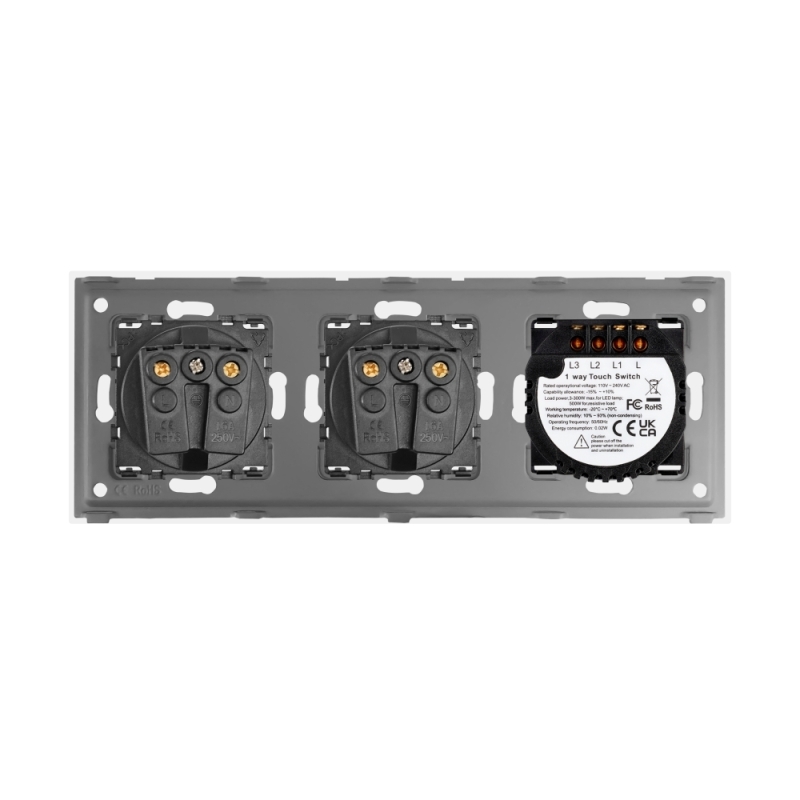 Intrerupator triplu + 2 prize cu rama din sticla LUXION cu design compact, elegant si minimalist. Structura este durabila, iar produsele nu se decoloreaza in timp. Este un produs practic, fabricat din materiale de calitate si rezistente in timp, ce ofera utilitate si confort casei tale.
