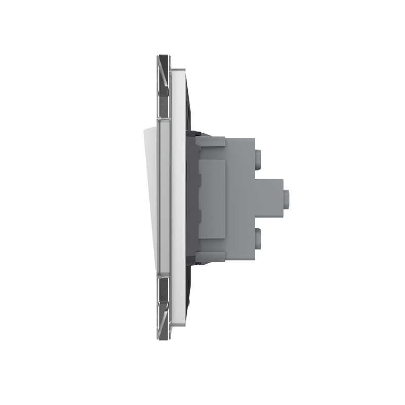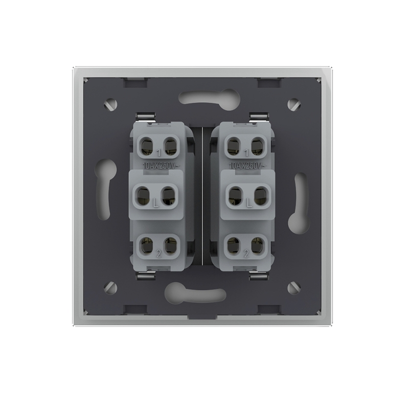 Intrerupator dublu mecanic cu rama din sticla Livolo. Produsul este compatibil cu ramele din sticla pentru doze standard german sau doze modulare italiene. Poate fi folosit ca intrerupator cap scara
