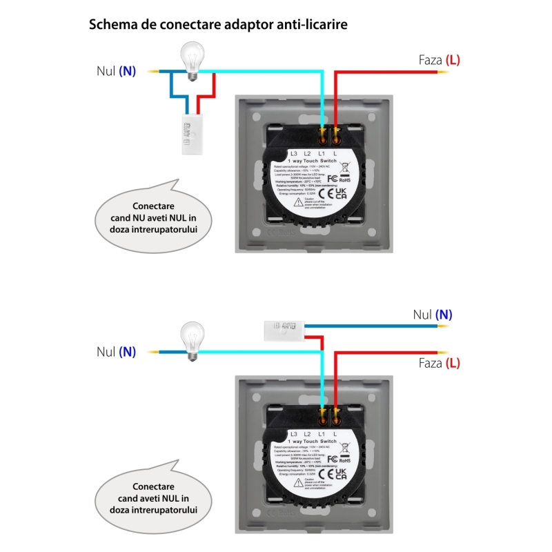 Adaptorul Luxion se foloseste pentru a evita licarirea becurilor LED, cand intrerupatorul este in pozitia OFF. Se monteaza la corpul de iluminat, in paralel cu acesta, pe faza si pe nul. Acest adaptor NU se poate monta in doza de intrerupator.