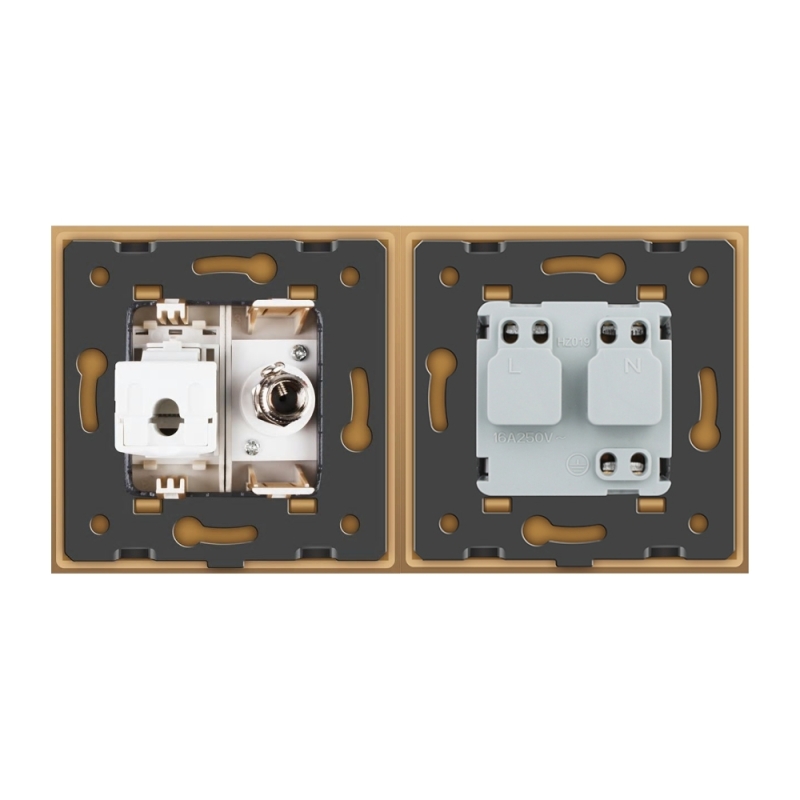 Priza dubla Livolo cu rama din sticla 1 priza Schuko+TV/internet, Auriu, VL-C7C2EU/VC-13