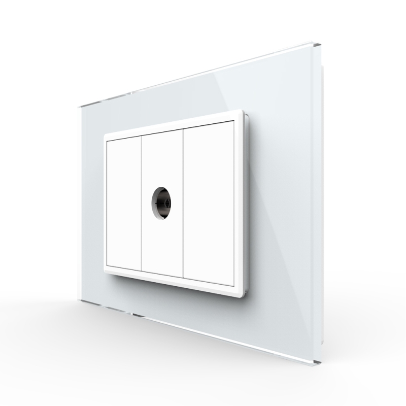 Priza Livolo pentru TV, cu rama din sticla, pentru dormitor, birou, camera copilului. Produse moderne de inalta calitate. Produsul este compatibil cu doze modulare in 3 module cu distanta dintre suruburi de 85 mm.