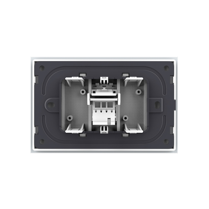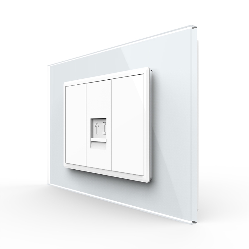 Priza Livolo pentru telefon, cu rama din sticla, pentru dormitor, birou, camera copilului. Produse moderne de inalta calitate. Produsul este compatibil cu doze modulare in 3 module cu distanta dintre suruburi de 85 mm.