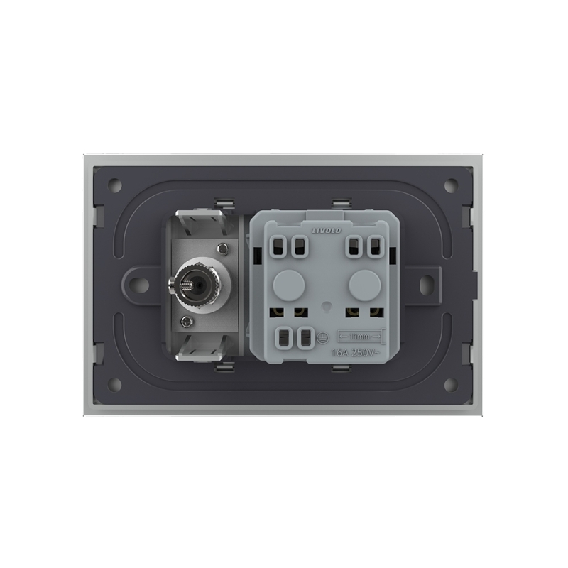 Priza simpla cu TV Livolo cu rama din sticla, model italian pentru case, birouri, spatii comerciale, hoteluri. Produse moderne de inalta calitate. Produsul este compatibil cu doze modulare in 3 module cu distanta dintre suruburi de 85 mm.
