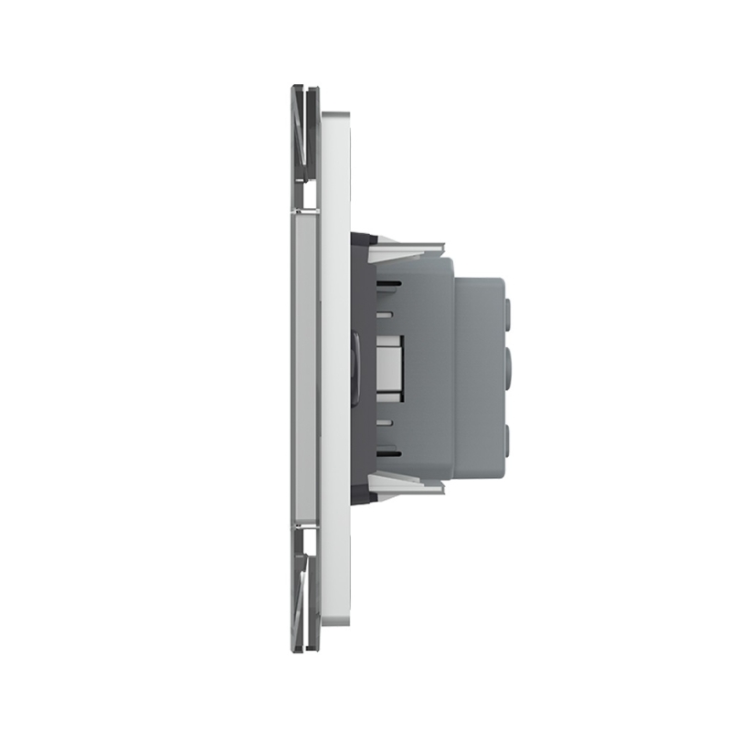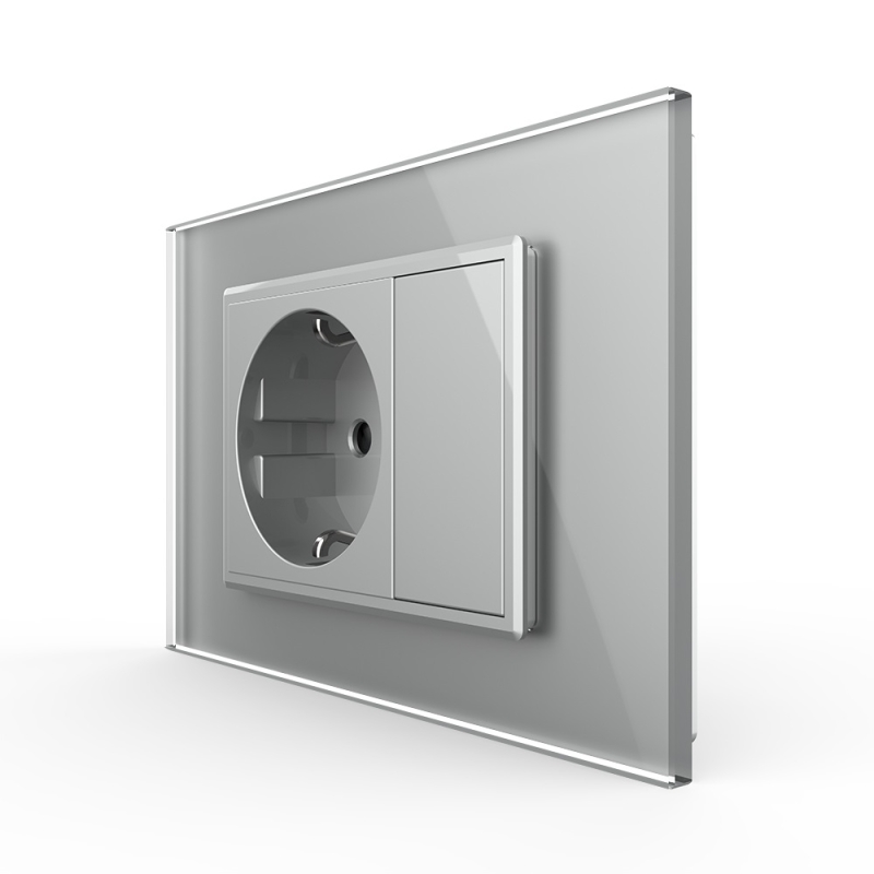 Priza simpla Livolo cu rama din sticla, model italian pentru case, birouri, spatii comerciale, hoteluri. Produse moderne de inalta calitate. Produsul este compatibil cu doze modulare in 3 module cu distanta dintre suruburi de 85 mm.