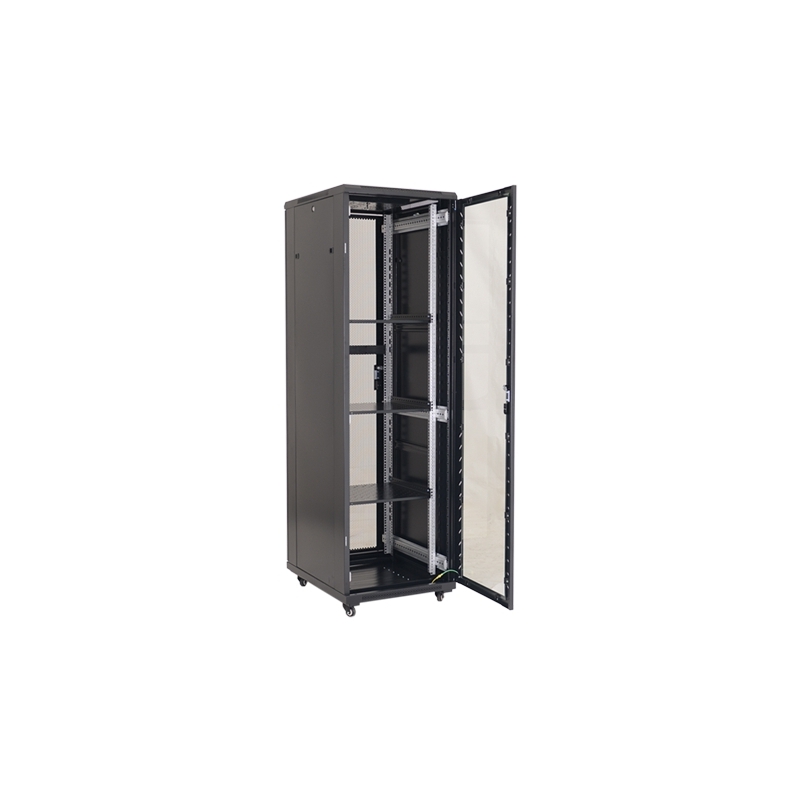 Cabinet metalic neasamblat de podea ce permite instalarea echipamentelor standard 19' dar si a celor pentru CCTV, CATV prin utilizarea de rafturi aditionale.