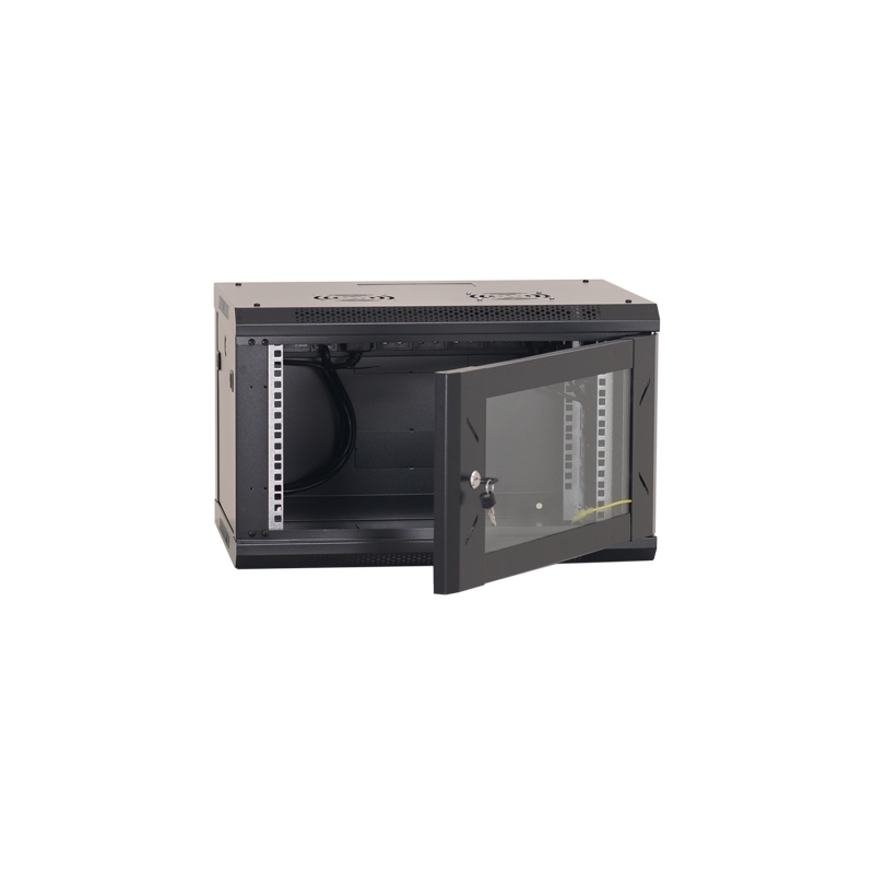 Cabinet metalic neasamblat cu montare pe perete ce permite instalarea echipamentelor standard 19' dar si a celor pentru CCTV, CATV prin utilizarea de rafturi aditionale.