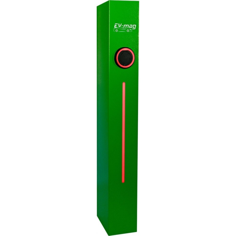 Statie de incarcare masini electrice, plug&charge, tip stand, alimentare trifazata, 380V/32A, 2x22 kW, cu outlet Type 2, LED prezenta tensiune, LED incarcare, dimensiuni 1500x200x200, alimentare 380VAC ± 10%, frecventa 50Hz, protectie intemperii IP55, protectie antivandal IK10, carcasa otel 2mm, culoare verde RAL 6018, blocare mufa in momentul alimentarii, protectie RCBO, CE.